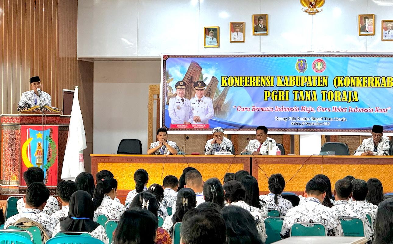 TATOR, PEDOMANINDONESIA – Persatuan Guru Republik Indonesia (PGRI) Kabupaten Tana Toraja memposisikan diri sebagai solusi utama bagi setiap persoalan guru sekaligus mitra strategis pemerintah daerah. Penegasan ini disampaikan dalam Konferensi Kerja Kabupaten (Konkerkab) I yang sukses digelar pada Sabtu, 27 September 2025, di Ruang Pola Kantor Bupati Tana Toraja.